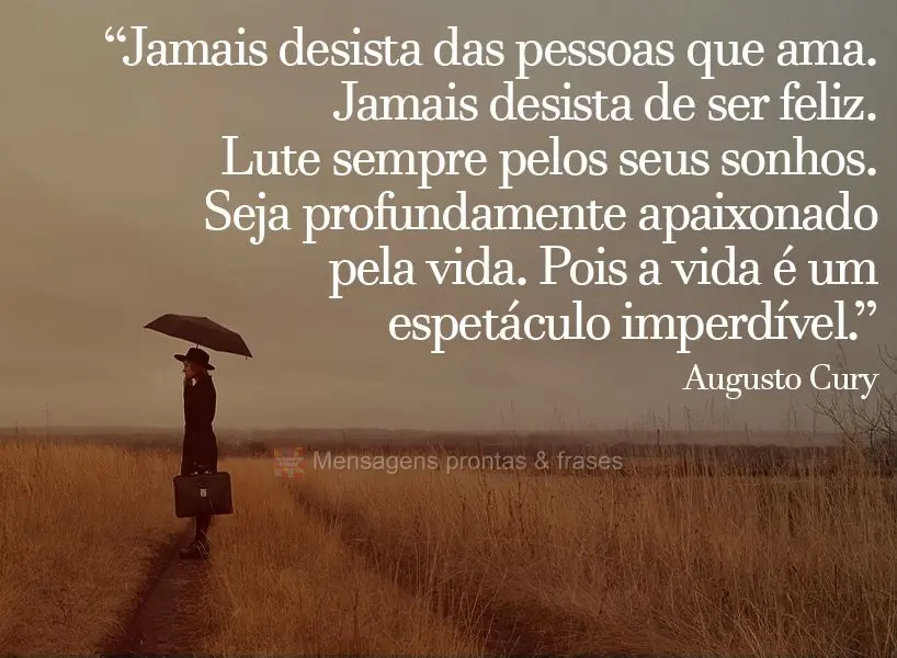 “Jamais desista das pessoas que ama. Jamais desista de ser feliz. Lute sempre pelos seus sonhos. Seja profundamente apaixonado pela vida. Pois a vida é um espetáculo imperdível.” Augusto Cury #motivação