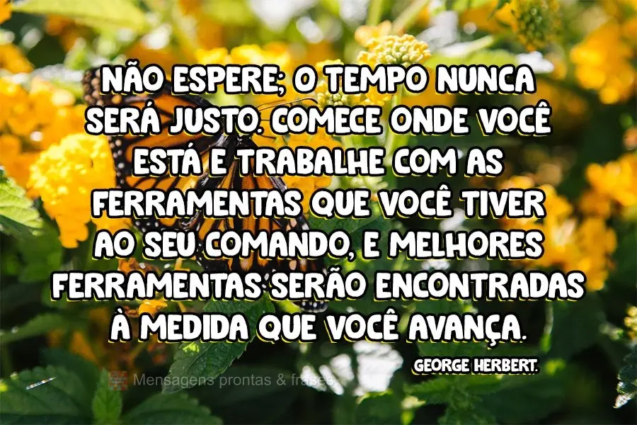 Não espere; O tempo nunca será justo. Comece onde você está e trabalhe com as ferramentas que você tiver ao seu comando, e melhores ferramentas serão encontradas à medida que você avança. George Herbert. #motivação