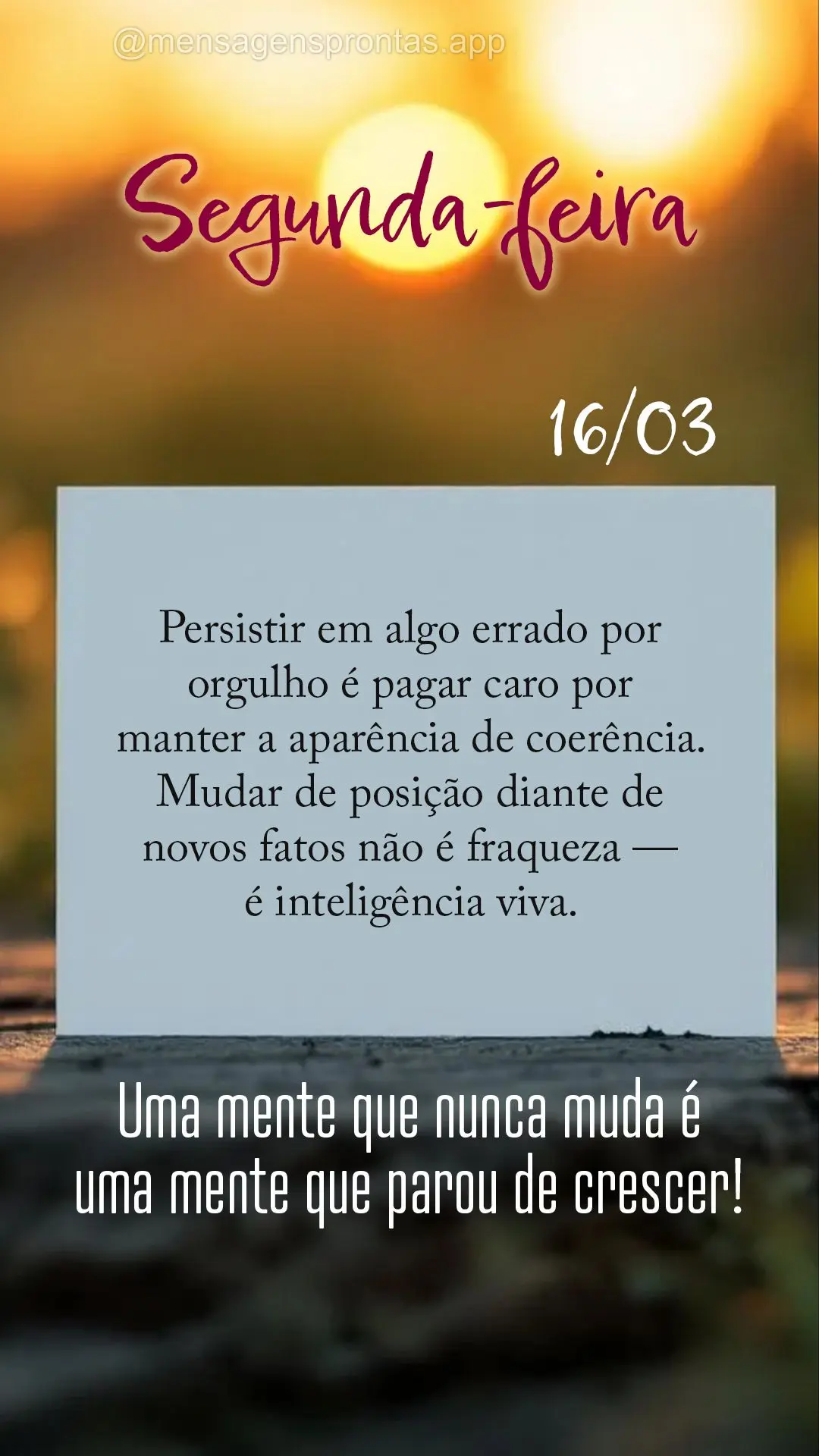 A sociedade lucra com a sua insegurança. Mas a verdade é que você, imperfeito e em construção, já tem valor inalienável. Cresça, melhore — mas não a partir da crença de que você é menos. Você não precisa se consertar para merecer ser amado. 19/03 Quinta-feira